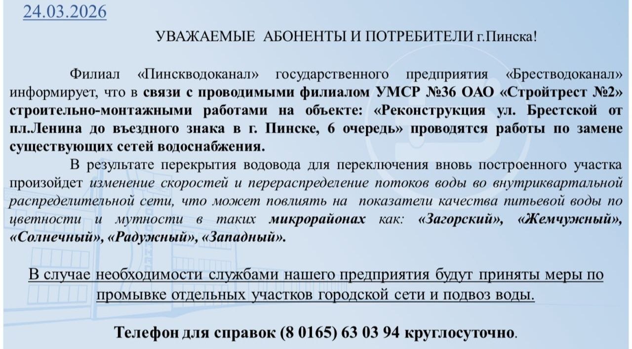 24 Мар Проводятся работы по замене существующих сетей водоснабжения по улице Брестской ПинскВодоканал2026-03-24T15:41:47+03:00 От ПинскВодоканал